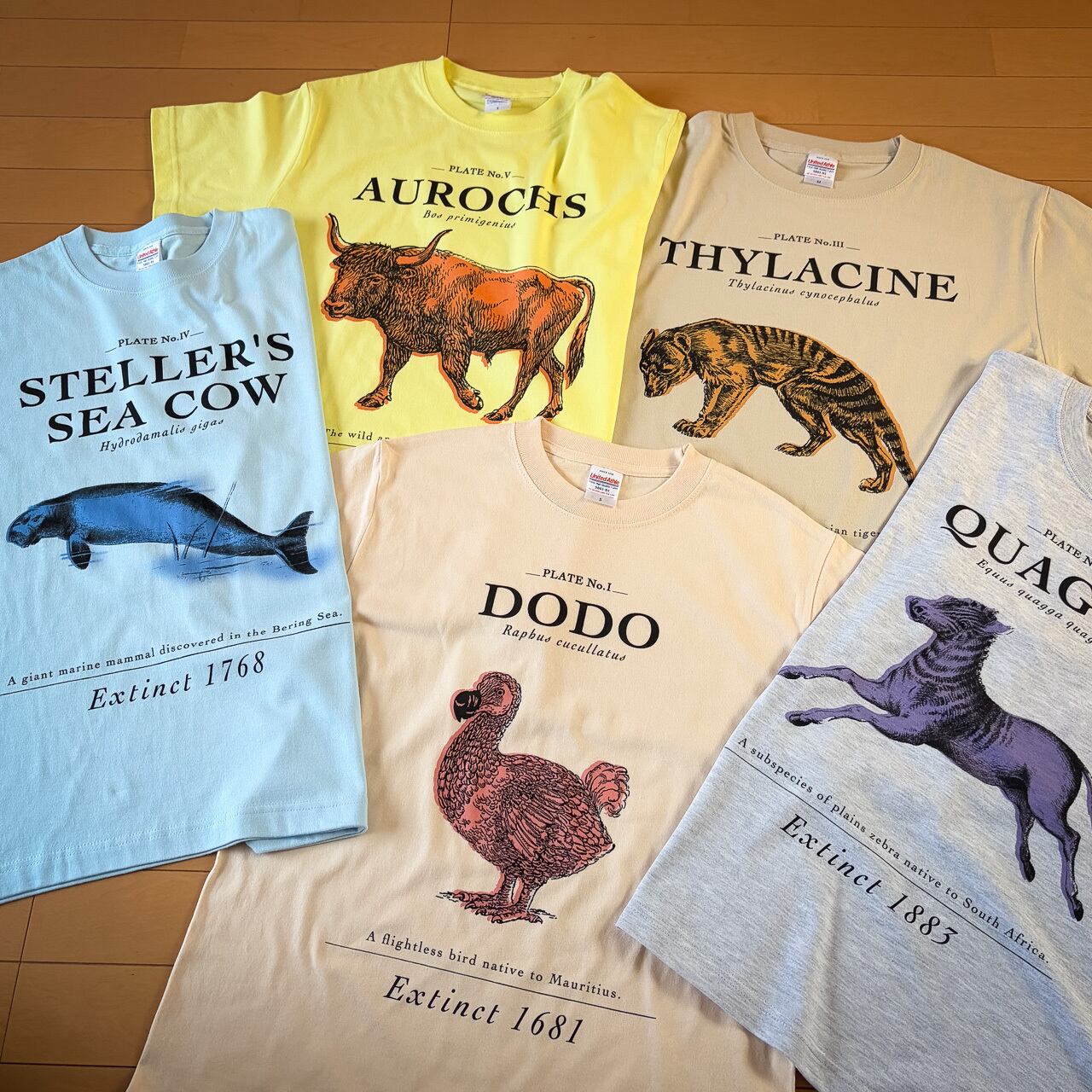 絶滅動物図鑑Tシャツ「Extinct Archives」シリーズは、かつて存在した動物たちから全5種をピックアップしたオリジナルTシャツです。