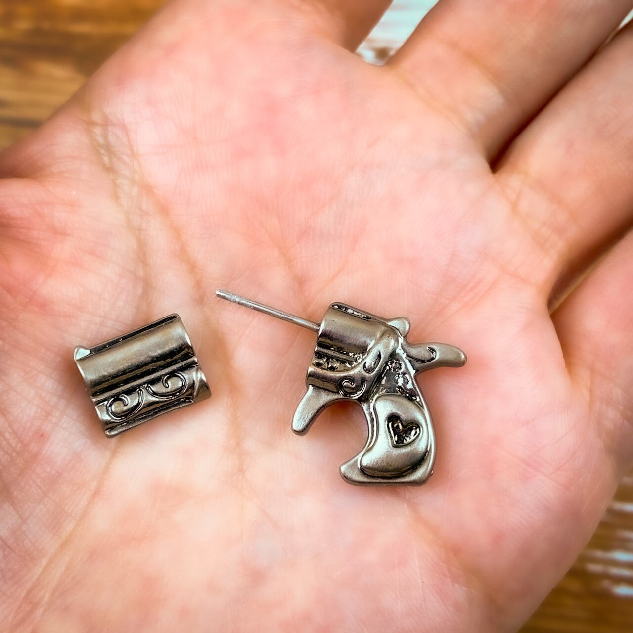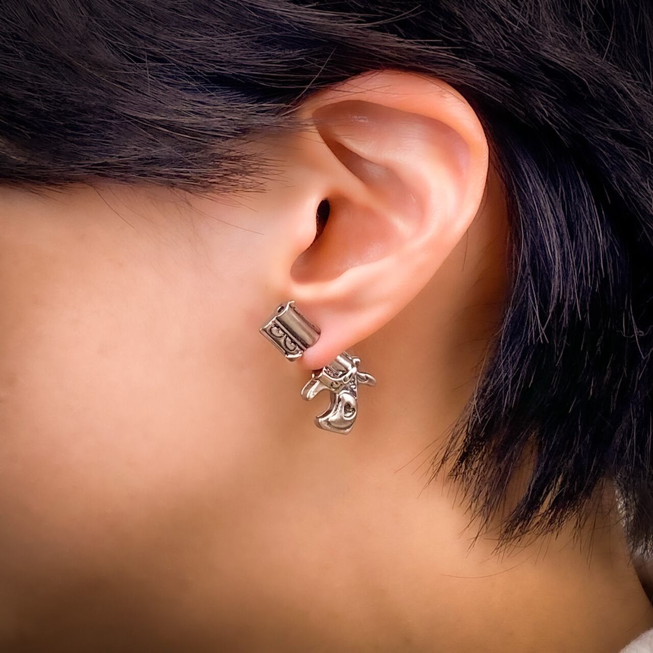 ピストルの銃身&弾丸が耳を貫通しているように見えるインパクト大!なアシンメトリーピアスです!